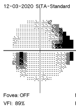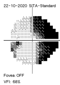 In April 2020, I noticed small, intermittent visual anomalies, such as increased light sensitivity, ghosting of images and grey areas. I put this down to being tired and my brain not filling these in as well as it used to. I kept up my regular screening and just kept on going with all I had to achieve. After a small change in my field, I was diagnosed with normal-tension glaucoma and started taking eye drops to control this. At this point, the visual field in my left eye was almost normal; I kept on thinking things were well controlled.