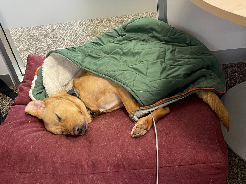 Sienna chilling at work on the bed Sara made her under her 70s inspired dog sleeping bag.